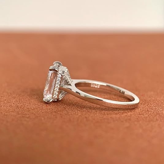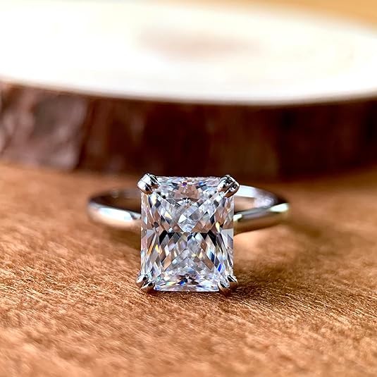 • 这款戒指的戒指宽度约为 2 毫米,8 爪镶 D 色 4 克拉辐射莫桑石(8x10 毫米),莫桑石具有非常迷人的火色,就像真正的钻石。